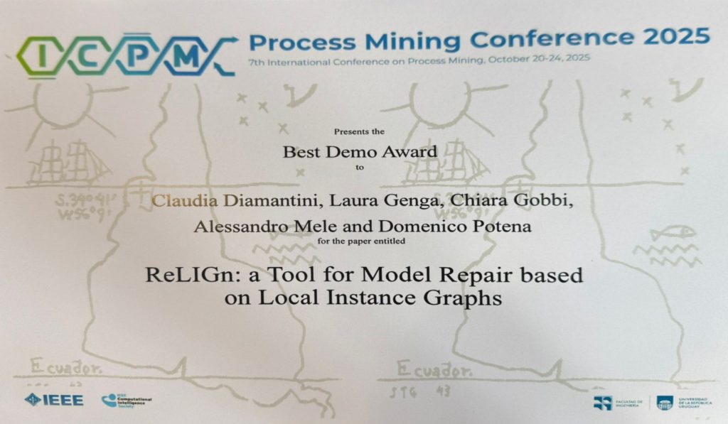 Con grande piacere vi comunichiamo che il lavoro “ReLIGn: a Tool for Model Repair based on Local Instance Graphs”, coautorato da Claudia Diamantini e Domenico Potena del DII, da Laura Genga della Eindhoven University of Technology, dalla dottoranda Chiara Gobbi e dal dottorando Alessandro Mele durante la 7th International Conference on Process Mining, conferenza di riferimento per la comunità del Process Mining svoltasi a Montevideo, Uruguay, dal 20 al 24 ottobre 2025, si è aggiudicato il Best Demo Award.