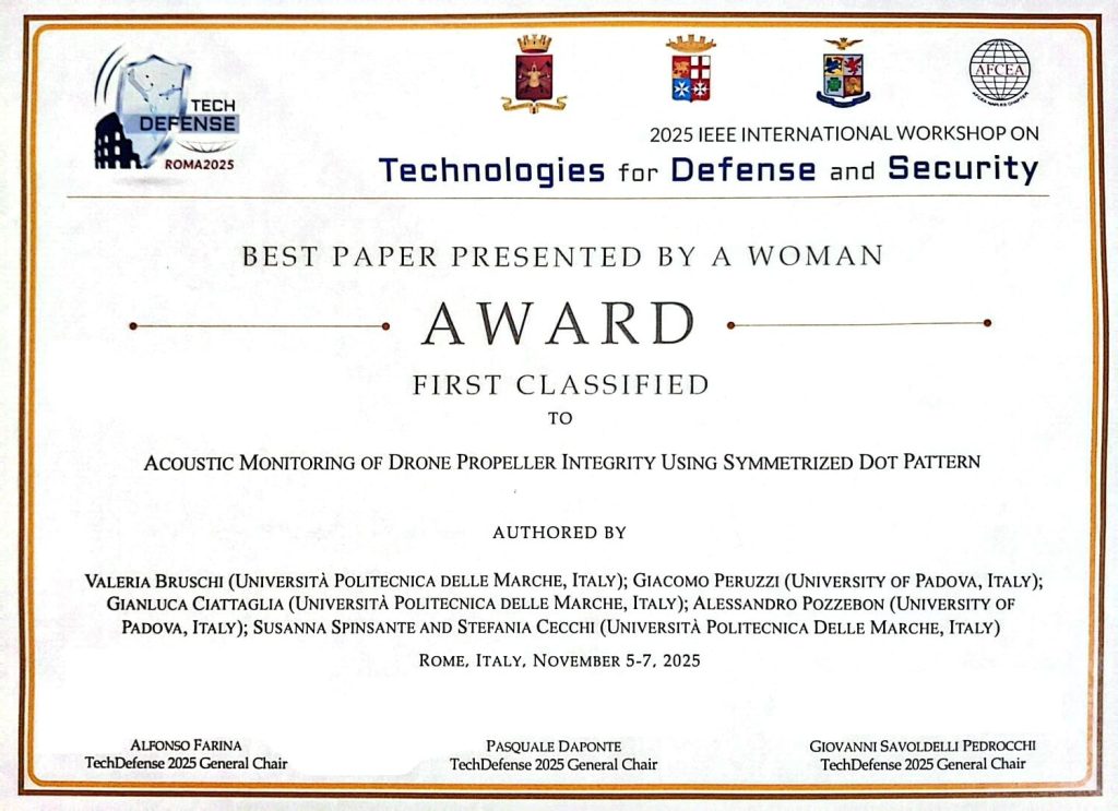 Con grande piacere vi comunichiamo che il lavoro “Acoustic Monitoring of Drone Propeller Integrity Using Symmetrized Dot Pattern”, coautorato da Valeria Bruschi, Gianluca Ciattaglia, Susanna Spinsante, Stefania Cecchi del DII, e da Giacomo Peruzzi e Alessandro Pozzebon dell’ Università di Padova, durante l’IEEE International Workshop on Technologies for Defense and Security svoltasi a Roma dal 5 al 7 novembre 2025, si è aggiudicato il Best Paper Award.