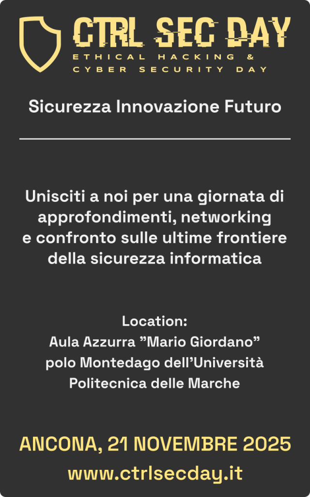 CtrlSecDay nasce con l’obiettivo di promuovere la consapevolezza sui temi dell’ethical hacking, della cybersecurity, e dell’innovazione tecnologica, creando un punto di incontro tra il mondo accademico, le aziende e le community del settore.