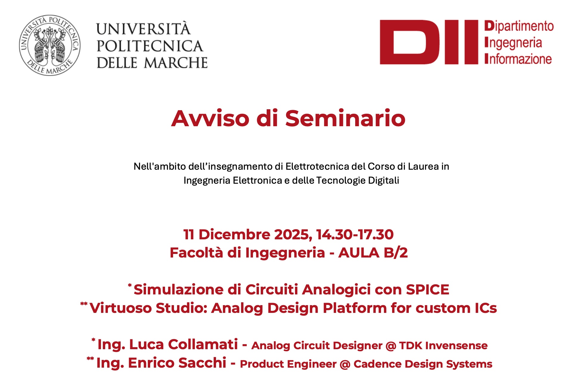 Si comunica che Giovedì 11 dicembre 2025, alle ore 14.30, in aula B/2 della Facoltà di Ingegneria, si terrà un seminario tecnico relativo al mondo della simulazione circuitale. Il seminario prevede due contributi, distinti ma complementari:
